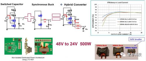 2)面對5G通信市場,ADI研發(fā)了一個沒有電感的轉(zhuǎn)換器,通過4個MOS管去做電壓轉(zhuǎn)換,面積僅占2.8 X 2.8cm,可輸出48伏到24伏 500W,在全范圍可以做到99%的效率,并且可以往12伏轉(zhuǎn),實現(xiàn)97%以上的效率,這是傳統(tǒng)電源做不到的。新一代的產(chǎn)品LTC7821混合轉(zhuǎn)換器把一個用電容做能量傳輸?shù)碾娐泛蜆藴式祲弘娐氛掀饋?,變成一個混合電路,高到97%的效率。